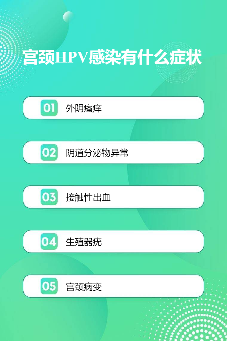 宮頸 HPV 感染可能出現的症狀包括外陰瘙癢、陰道分泌物異常、接觸性出血、生殖器疣、宮頸病變等。