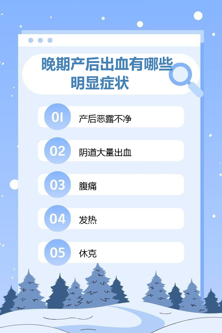 晚期產後出血的症狀包括產後惡露不淨、陰道大量出血、腹痛、發熱、休克等。
